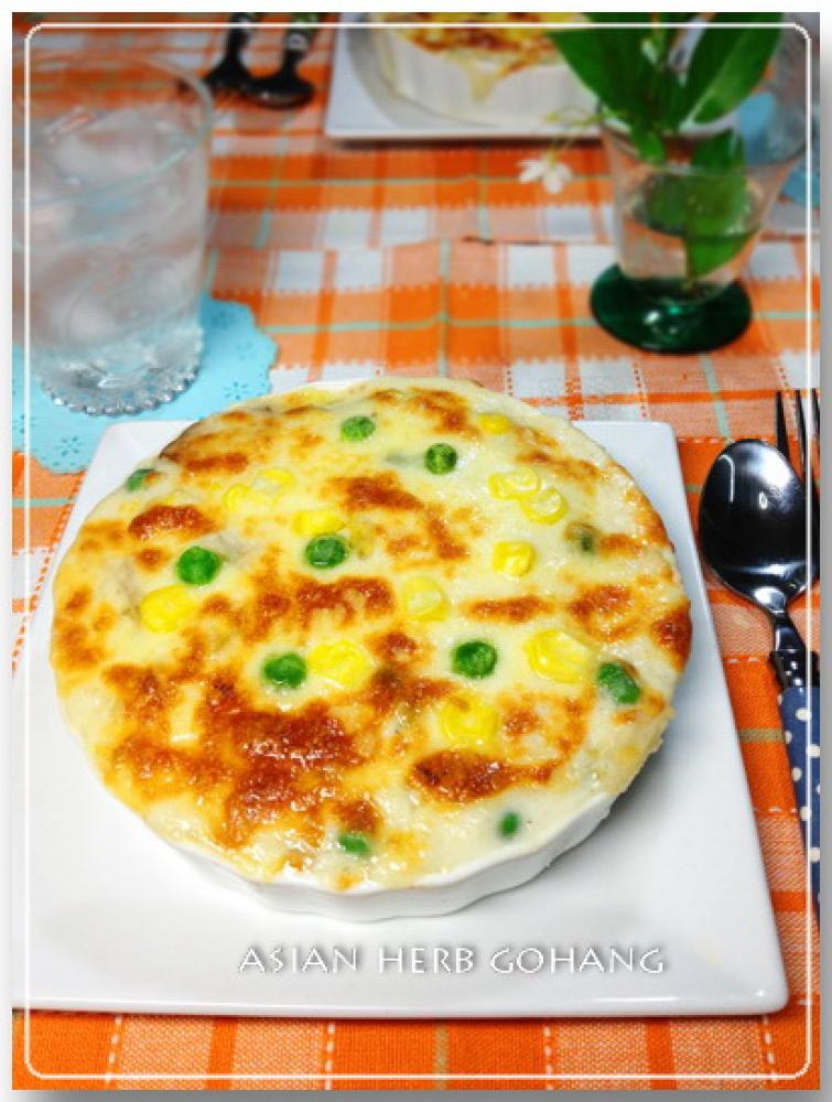 ![]() 3のソースと4の具材を混ぜ、バター(分量外)を塗ったグラタン皿に入れ、Aの残り少々を散らし、パルメザンチーズをかけます。