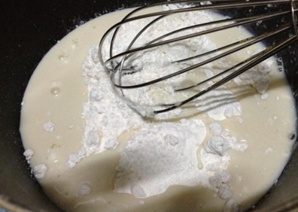 ![]() Bで豆乳ベシャメルソースを作る。薄力粉を鍋に振るい入れ豆乳のうち約50ccを加え、泡だて器でダマがなくなるまでよく混ぜる