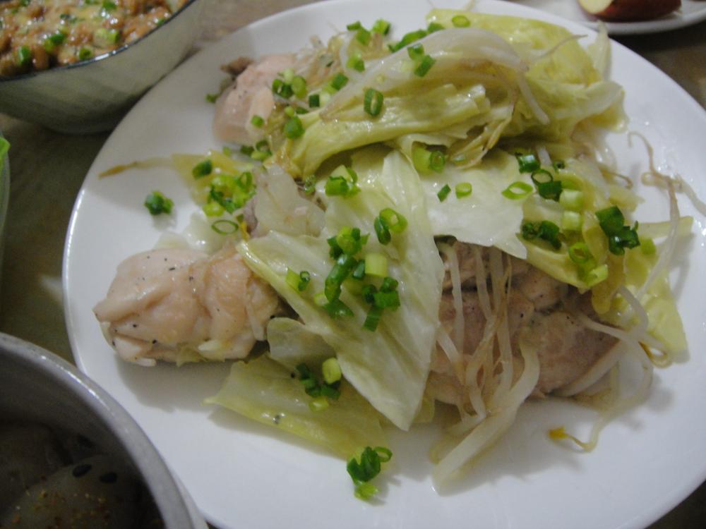 上にもやし・キャベツをのせ、酒をふり蓋をして中火にかける。 |