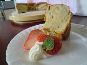 切り分けて器に盛り、お好みでホイップクリームやフルーツを添えます。
