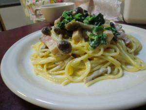 5に茹で上がったパスタを加え、粉チーズを加え、最後に2の菜の花を加えて、手早く混ぜます。
