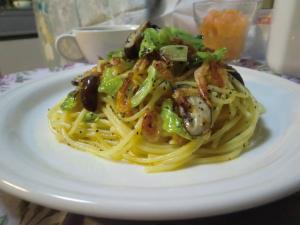 4に茹で汁少々を入れて混ぜ、乳化させ、茹で上がったパスタを入れて手早く混ぜます。