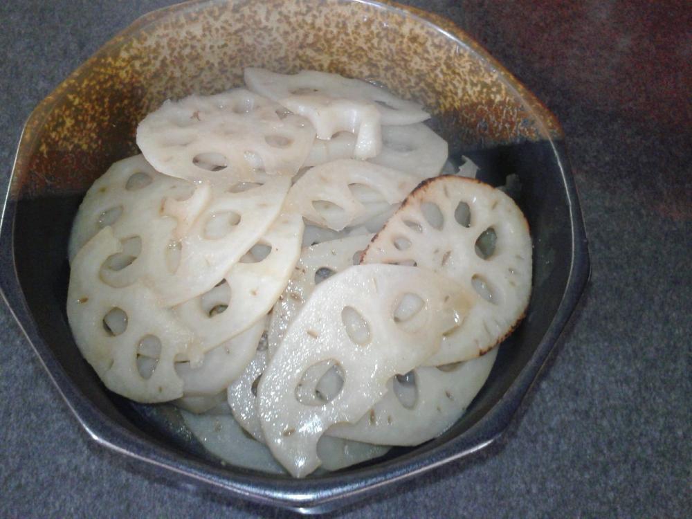 れんこんは薄切りにし、さっと水洗いします。