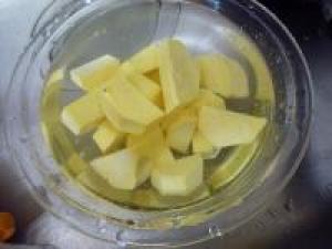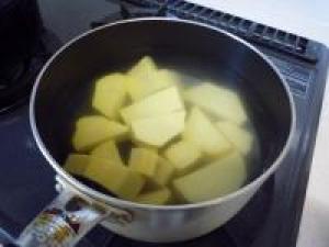 ![]() あく抜きをした、サツマイモを柔らかくなるまで茹でます。