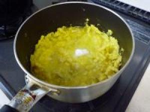 ![]() 柔らかくなったら、お湯を切って。サツマイモをマッシュします。