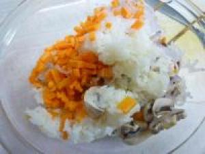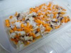 ![]() ご飯、人参、マッシュルーム、シラタキを一緒にしてボールで混ぜ合わせます。
