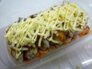 ![]() さらにそに上に、ピザ用チーズ、マヨネーズをのせます。
