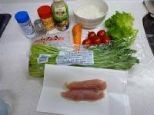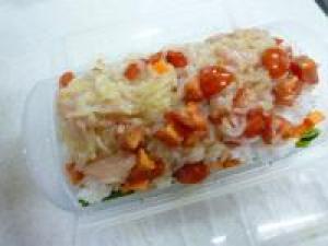 ![]() あとは、レンジで6~9分加熱して3分ほど蒸らして混ぜ合わせて、飾りつけした野菜の真ん中に盛りつけたら完成です。