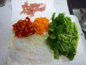 ![]() しらたきは洗って水をよく切り、みじん切りにします。人参も皮をむいて、みじん切りにします。