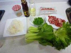 ![]() 牛肉は食べやすい大きさに切ります。チンゲン菜は芯の部分は切り落とし、粗みじん切りにします。
