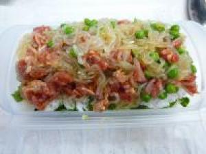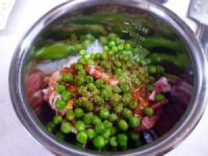![]() ボールに、牛肉、シラタキ、グリンピース、焼肉のたれ、砂糖、ダシ、油を入れてよく混ぜ合わせます。