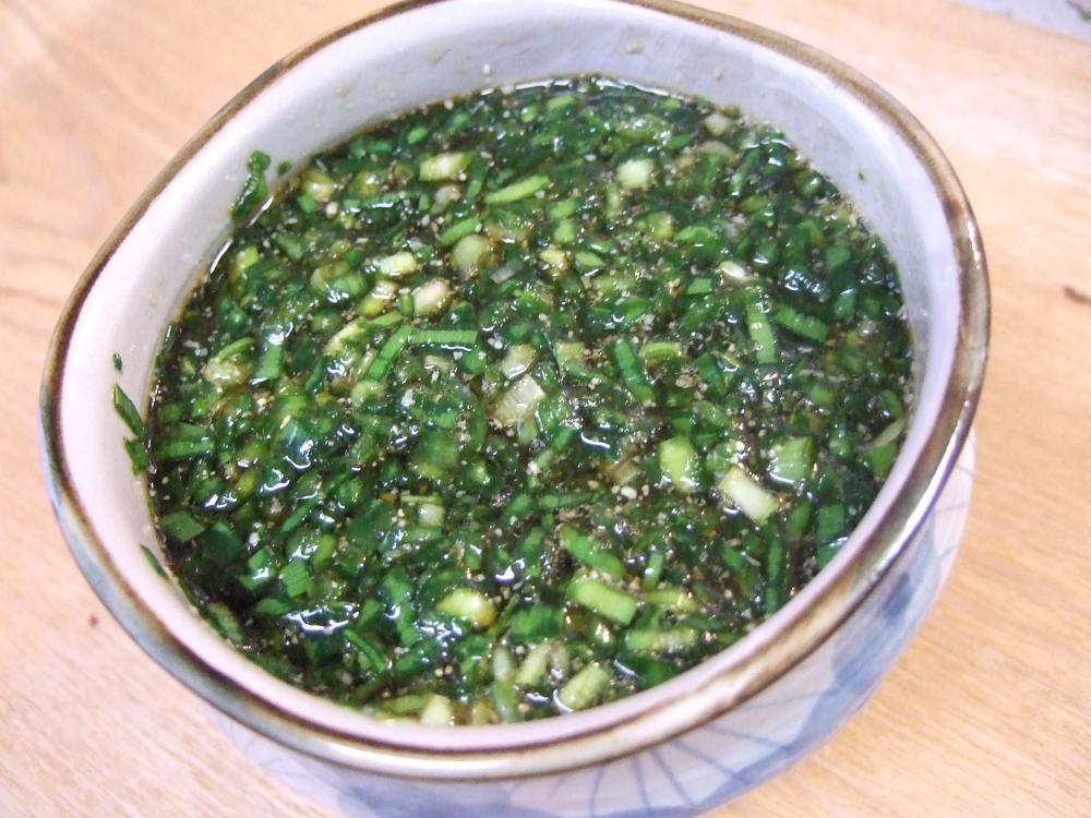 ![]() Aを全て混ぜ合わせ、ニラだれを作る。(1時間以上置くと味がなじみます^^)