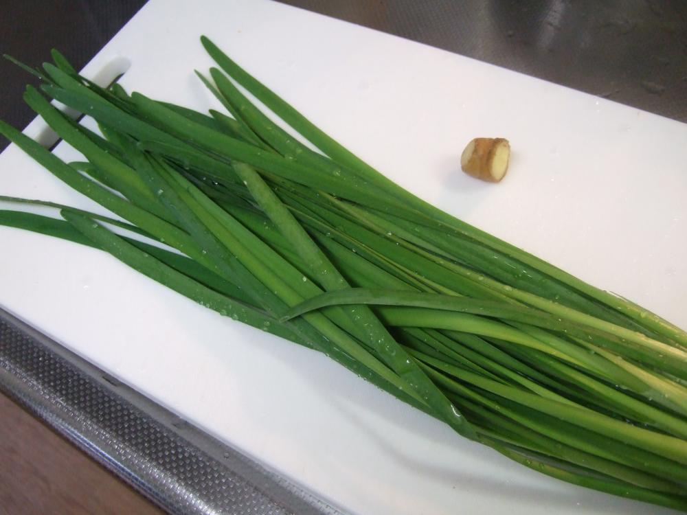 ![]() にらはみじん切りにし、生姜1片はすりおろす。