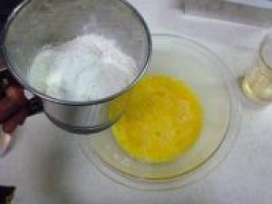 ![]() 小麦粉、ベーキングパウダーをふるい入れます。