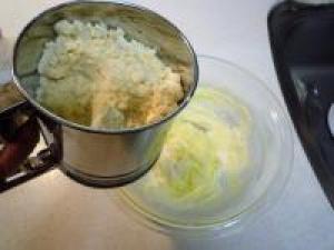 ![]() よく混ぜたら、そこにアーモンドパウダー、塩、小麦粉をふるって加えてゴムべらなどで切るように混ぜます。