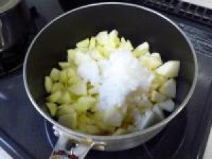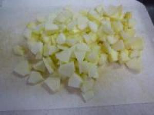 ![]() りんごは皮をむいて、芯をとりなるべく小さめにカットします。