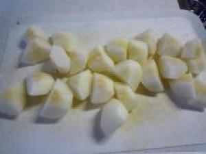 ![]() 梨は皮をむいて、芯をとりざく切りにします。