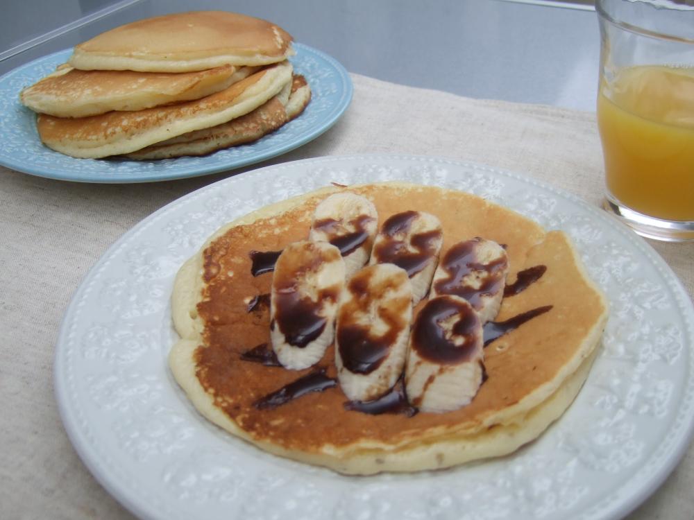 ![]() お好みで、果物や生クリーム、ベーコンなどを乗せて盛り付ける。