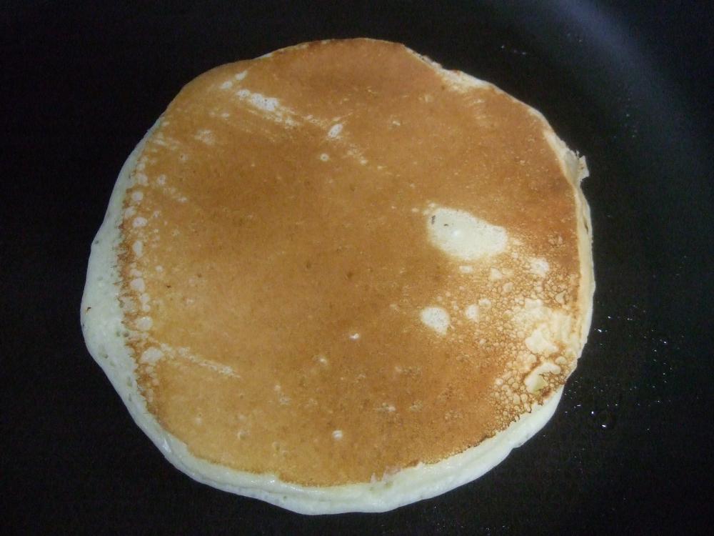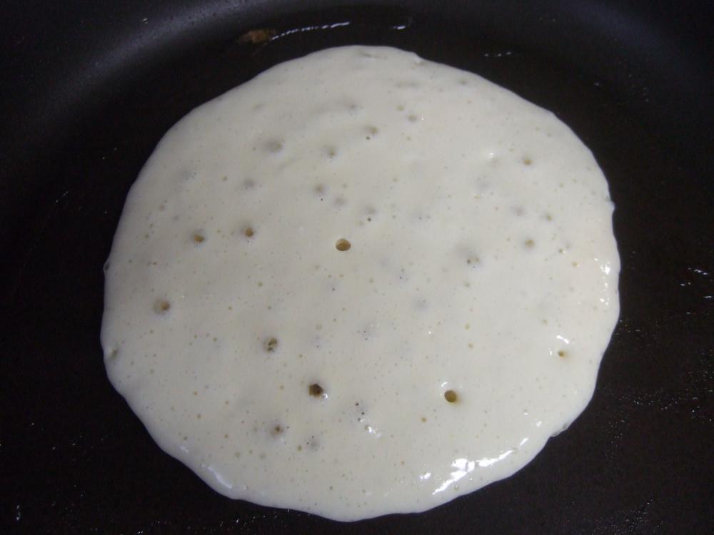 ![]() 1~2分焼いて、生地の表面にフツフツ気泡ができたら上下を返し、さらに1~2分焼く。