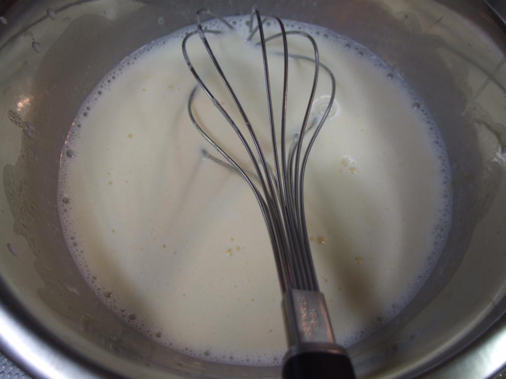 ![]() 別のボウルに卵を溶きほぐし、ヨーグルト、牛乳を加えて混ぜる。