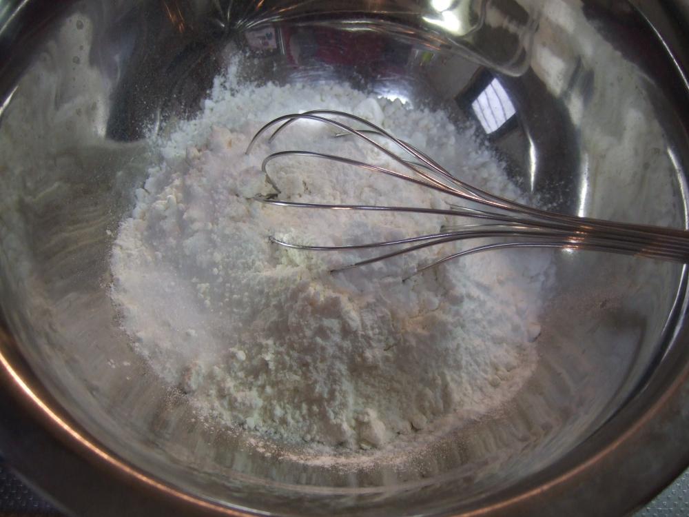 ![]() 薄力粉、グラニュー糖、ベーキングパウダー、塩をボウルに入れ、泡だて器で混ぜ合わせる。