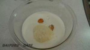 ![]() 卵3個と牛乳100cc、生クリーム100cc、粉チーズ大さじ2強、塩小さじ3分の2、コショウ少々を混ぜ合わせます。