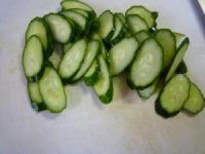 ![]() きゅうりは洗って、斜め薄切りにします。