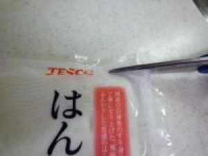 ![]() はんぺんは袋のはじに切れ目をいれて、レンジで40秒ほど加熱します。レンジがなければ茹でてください。