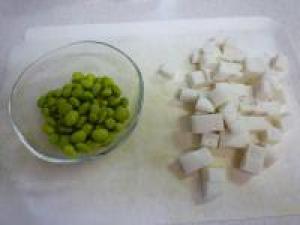 ![]() はんぺんは冷めたら、1cm角のサイコロじょうに切ります。枝豆はからから出しておきます。