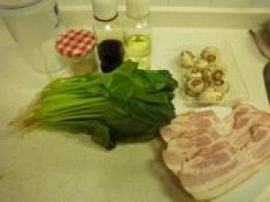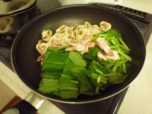 ![]() フライパンに油をひいて、ほうれん草、マッシュルーム、ベーコンを炒めます。