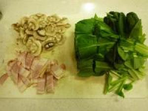 ![]() マッシュルームは薄切りにします。ベーコンは食べやすい大きさに切ります。