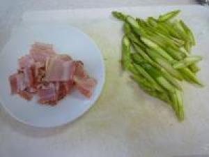 ![]() アスパラは洗って斜め切りにします、ベーコンは一口大の大きさに切ります。
