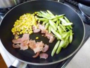 ![]() ベーコンに火がとおったら、アスパラ、コーンを加えてさらに炒めます。