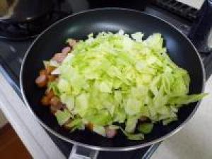 ![]() フライパンに油を引いて、中火でキャベツ、ウィンナーを炒めます。
