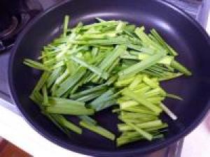 ![]() フライパンに大さじ1の油をひいて、ニラを炒めます。