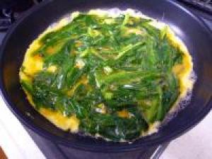 ![]() さらに、大さじ2の油をひいて卵とニラを流しいれ、かるーく混ぜ合わせて弱火~中火でやいていきます。