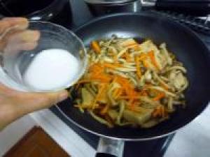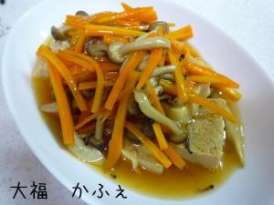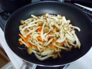 ![]() シメジ、人参に火がとおったら、弱火にして水溶き片栗粉を回しいれてとろみをつけたら完成です。