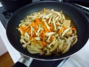 ![]() シメジは石突を切り落とし、ほぐします。人参は皮をむいて、5cmほどの長さの千切りに。豆腐は食べやすい、大きさに切ります。