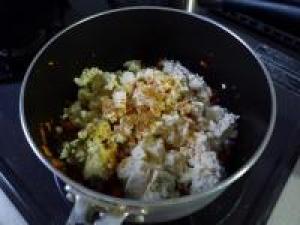![]() 火が通ったら、水切りしておいた豆腐を、手で崩しながらくわえます。