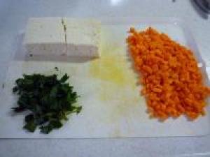 ![]() 豆腐はペーパータオルに包んでおもしをして1時間ほど水切りをしておきます。人参皮をむいて、しそは洗ってみじん切りにします。