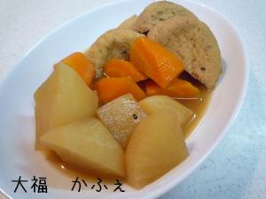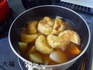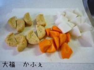 ![]() がんもは半分に切ります。大根、人参は皮をむいて一口だいの乱切りにします。