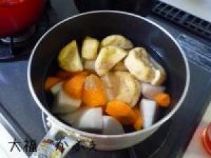 ![]() 鍋に大根、人参、がんも、ダシ、水400ccを入れて火に掛けます。