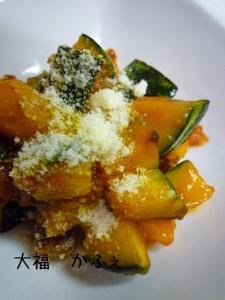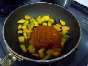 ![]() かぼちゃに竹串がとおるくらい柔らかくなったらミートソースで味付けしてお皿に盛って、粉チーズをふりかけたら完成です。