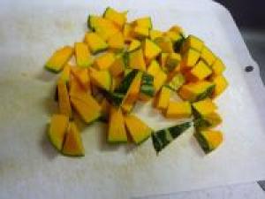 ![]() かぼちゃは洗って、小さ目のひと口大に切ります。