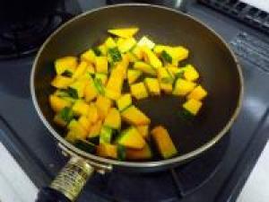 ![]() フライパンに油をひいて、かぼちゃをじっくり炒めていきます。
