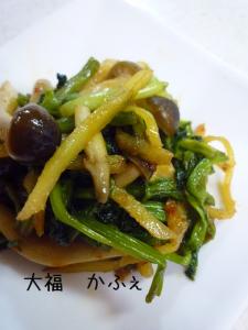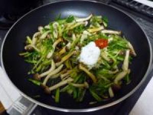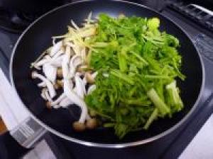 ![]() せり、シメジがしんなりしたら、豆板醤、砂糖、醤油で味付けして完成です。
