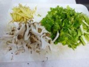 ![]() 生姜は千切りにします。シメジは石突を切り落として、手でほぐします。