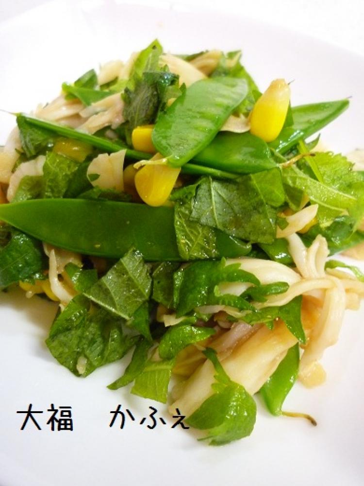 ![]() 絹さやは軽く洗います。マイタケは手で食べやすい大きさに裂きます。しそは洗って粗みじん切りにします。