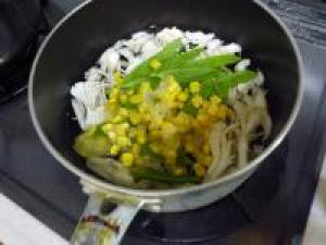 ![]() 鍋に水を入れ火にかけ、沸騰したらマイタケ、絹さや、コーンを茹でます。
