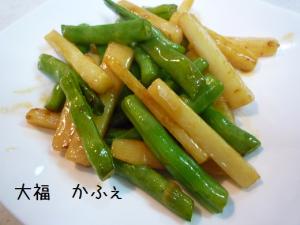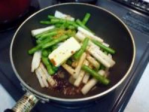 ![]() フライパンに油をひいて、長イモ、いんげんを炒めていきます。